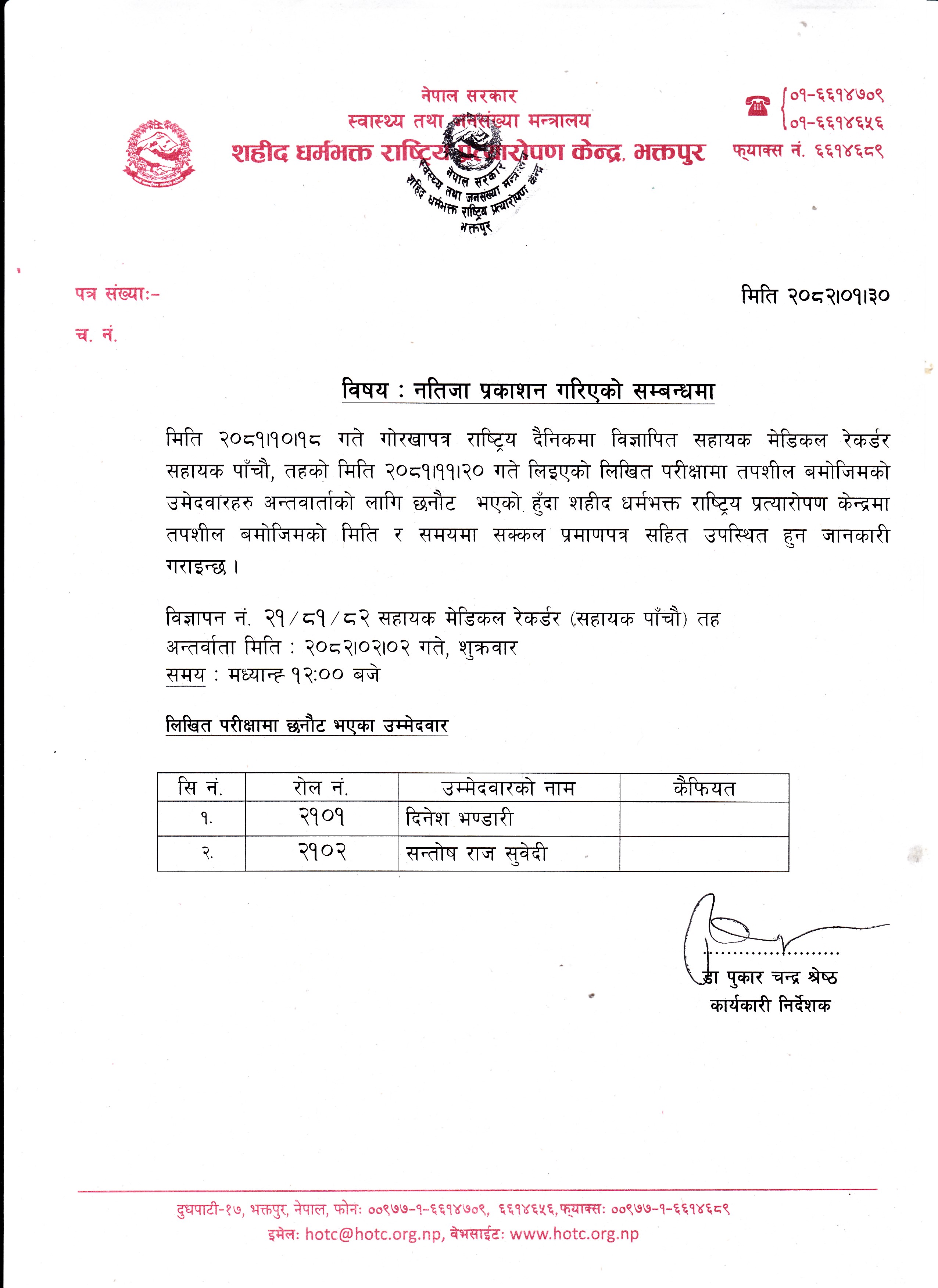 लिखित परिक्षाको नतिजा प्रकाशन सहायक मेडिकल रेकर्डर (सहायक पाँचौ) !!