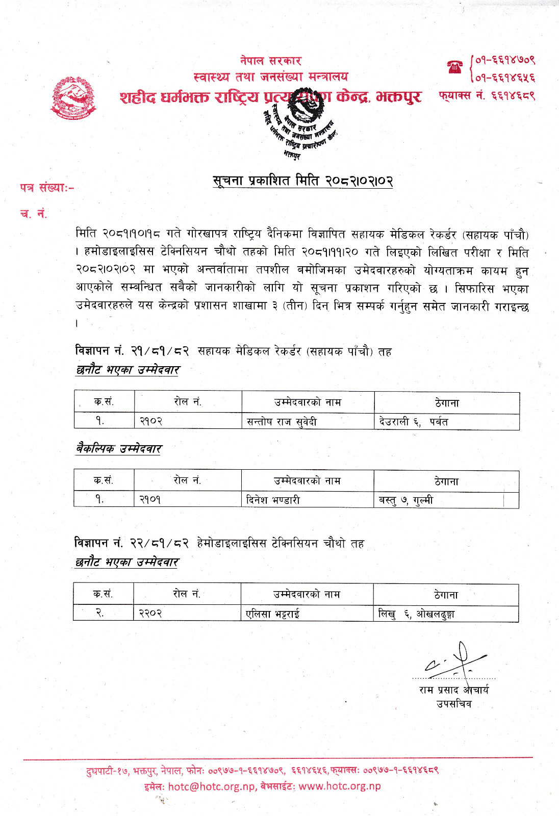 सहायक मेडिकल रेकर्डर (पाँचौ) र हेमोडाइलेसिस टेक्निसियन (चौथो)को अन्तिम नतिजा प्रकाशन!!!