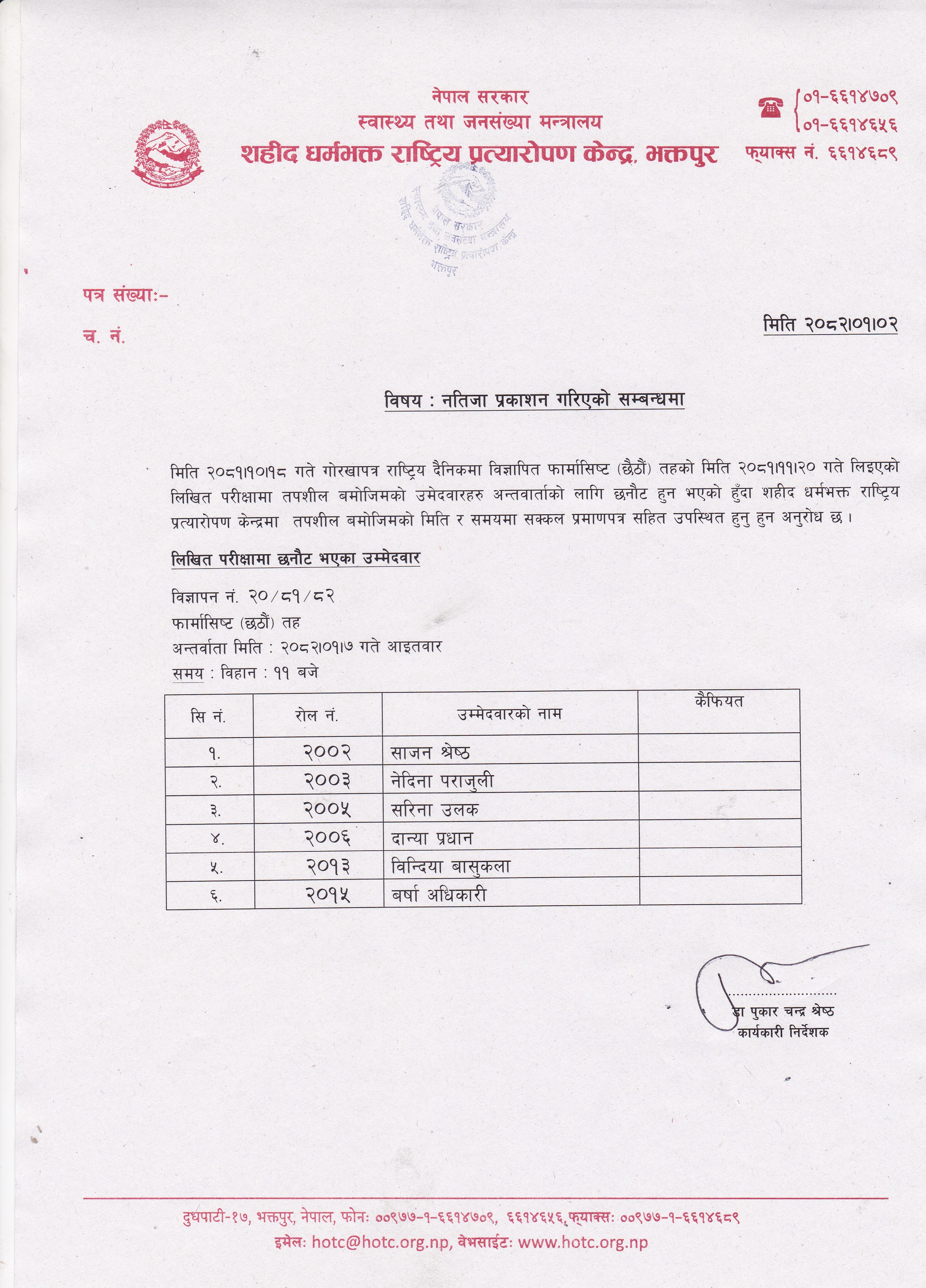 लिखित परीक्षााको नतिजा प्रकाशन !! फार्मासिष्ट (छैठौं)